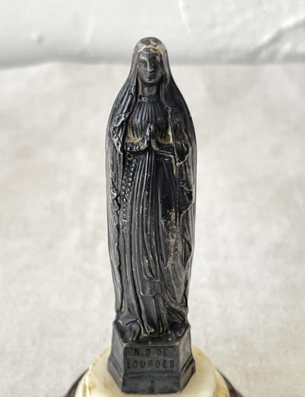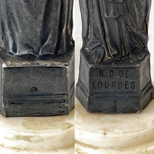 シンプルながらも、静謐な祈りの空気を感じさせる美しいアンティークです。ルルド信仰や聖母像のコレクションにふさわしい一点です。