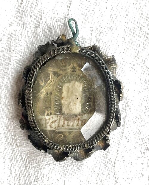 金属製(銀系?)容器は楕円形枠を持ち、中央に聖人名が記された紙片とともに、細工装飾を施したガラスの下に小片の聖遺物が封入されています。裏面には、赤い蝋封(シーリングワックス)と糸による封印が残り、完全な状態で当時のまま保存されています。