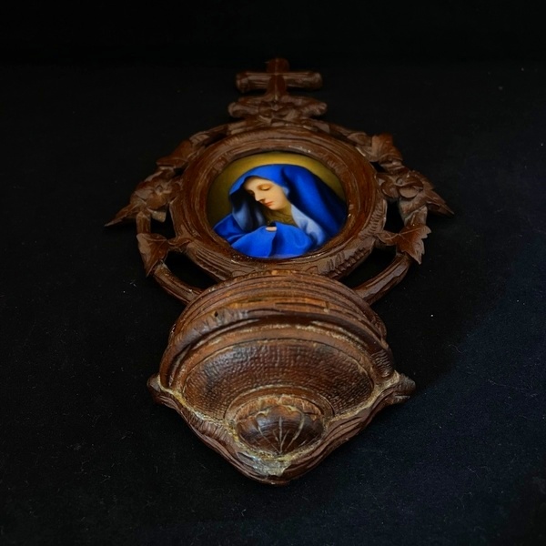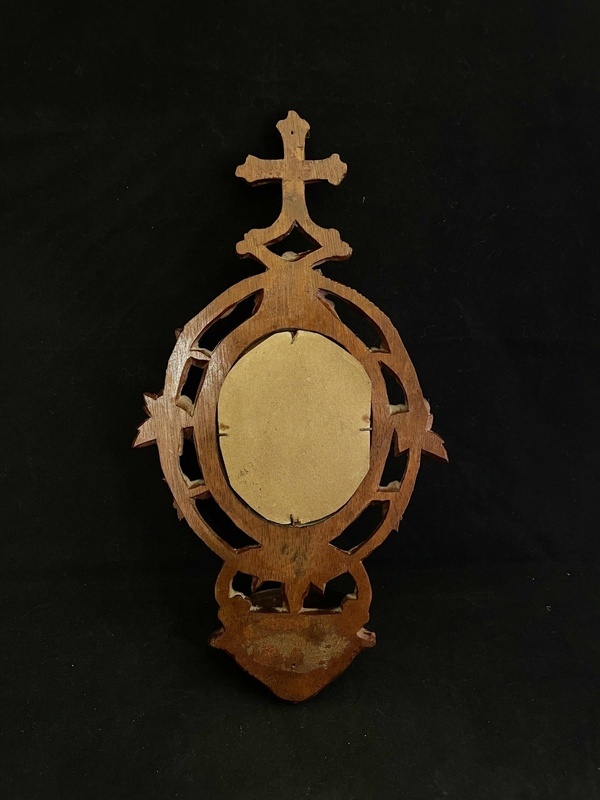 木製フレームは蔦葉と花のモチーフを組み合わせた手彫装飾で、上部には十字架、下部には小さな聖水盤を備えています。