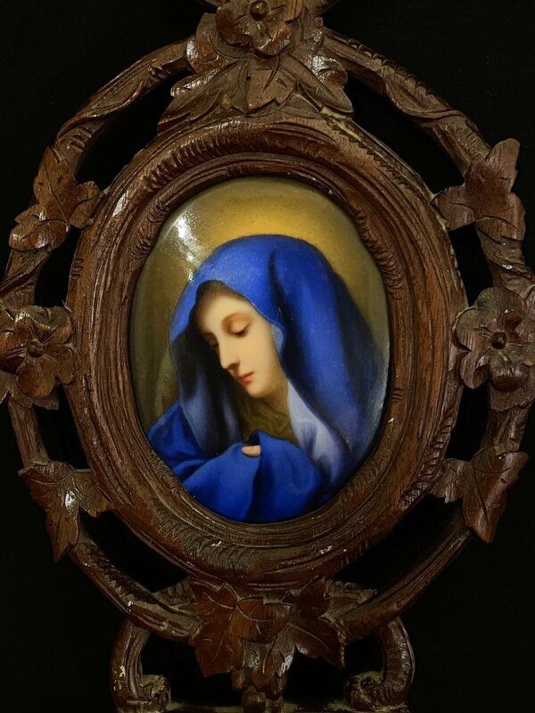 描かれた聖母像は、17世紀イタリアの画家カルロ・ドルチ(Carlo Dolci)の「悲しみの聖母」をもとにしたもので、深い青のヴェールに包まれた静かな祈りの姿が印象的です。また陶板は艶やかで発色も美しく、柔らかな陰影が清らかな宗教美をよく伝えています。