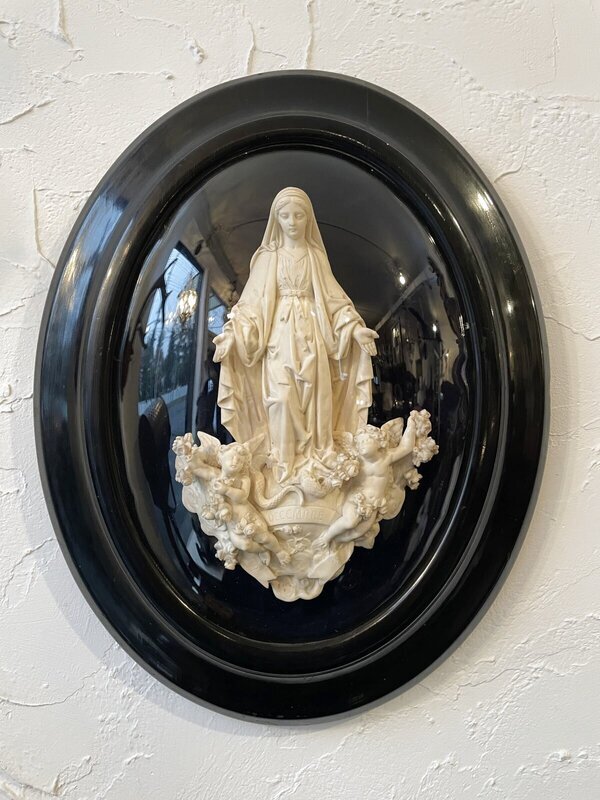 ナポレオン3世時代の黒いオーバルフレームがアイボリー色の聖母像を際立たせ、静謐で荘厳な印象を与えます。当時のフランスの家庭内の祭壇や修道院の壁を飾っていたもので、時代を経た美しいマチエールが感じられます。