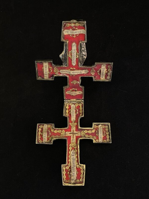 COMMENT/19世紀末(1880–1900年頃)にドイツ・ニュルンベルクで制作された、銀製十字架型聖遺物容器と聖遺物です。