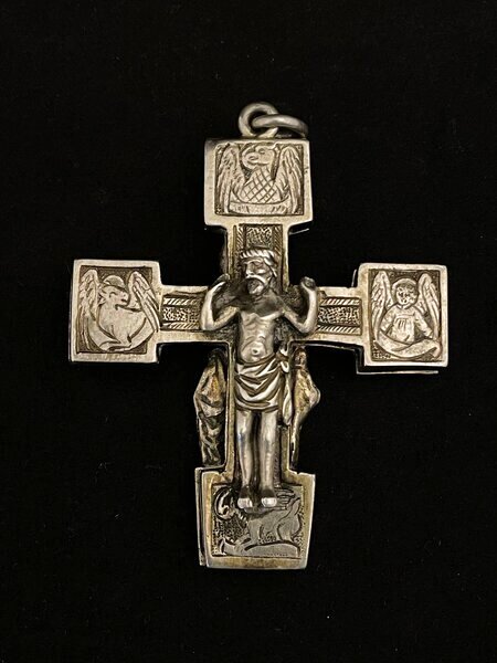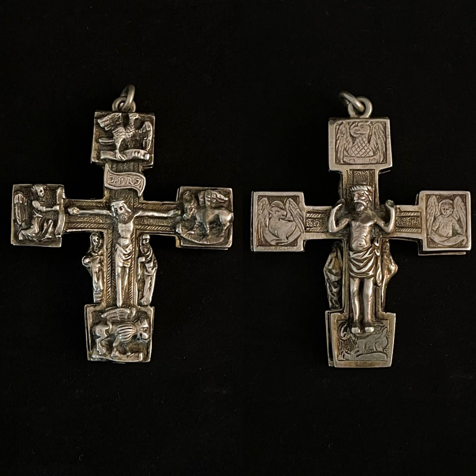 聖職者携帯用の聖遺物十字架で、片面には中世の威厳を示すロマネスク様式の「栄光のキリスト」が配され、もう片面にはゴシック様式の磔刑像と聖母マリア、聖ヨハネが表現されています。両面が異なる中世様式で構成される点は、19世紀ドイツで盛んであった歴史主義の特徴をよく示しています。